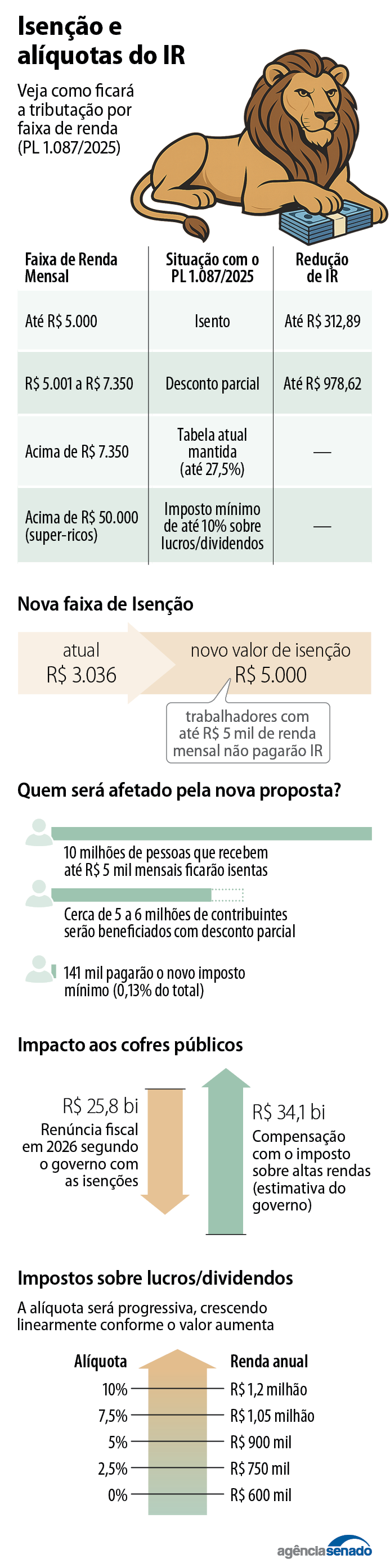 O imposto mínimo será suficiente para permitir a isenção total — para renda de até R$ 5 mil — e parcial — para renda entre R$ 5 mil e R$ 7.350, em que a redução é maior quanto menor a renda. Assim, o projeto não afeta as contas públicas, segundo Haddad.