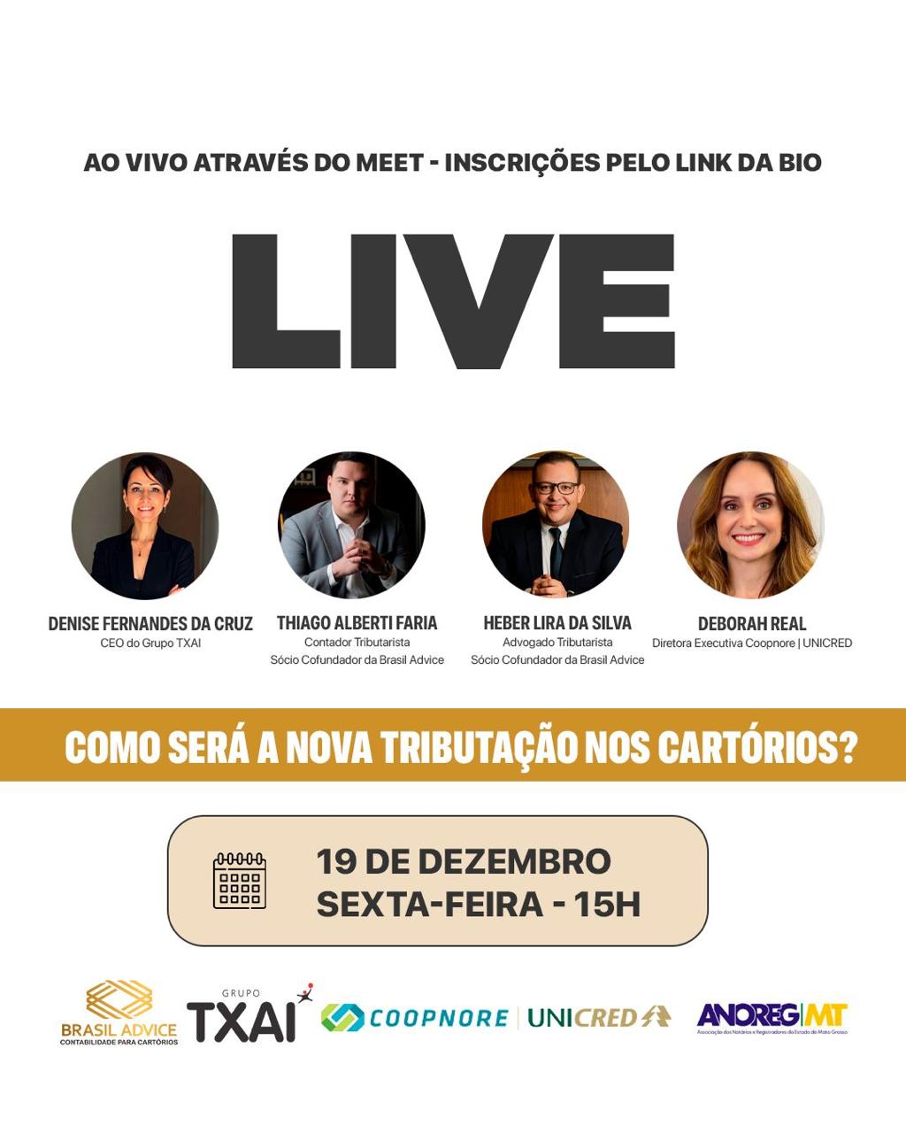 A live contará com a participação de Denise Fernandes da Cruz – CEO do Grupo TXAI; Thiago Alberti Faria – Contador Tributarista e Sócio Fundador da Brasil Advice; Heber Lira da Silva – Advogado Tributarista e Sócio Fundador da Brasil Advice; e Deborah Real – Diretora Executiva da Coopnore UNICRED.