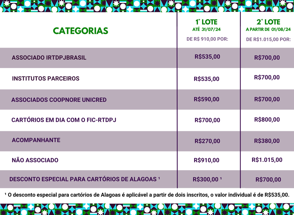 Para os valores anunciados no 1º lote, os Associados ao IRTDPJBrasil, Institutos parceiros, Associados Coopnore Unicred, registradores do Estado de Alagoas e cartórios em dia com o FIC-RTDPJ devem solicitar o código promocional pelo e-mail: eventos@irtdpjbrasil.org.br.