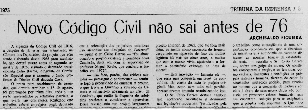 Reportagem publicada pela Tribuna da Imprensa em 1975, tratando do projeto do Código Civil, que viraria lei apenas em 2002 (Biblioteca Nacional Digital)