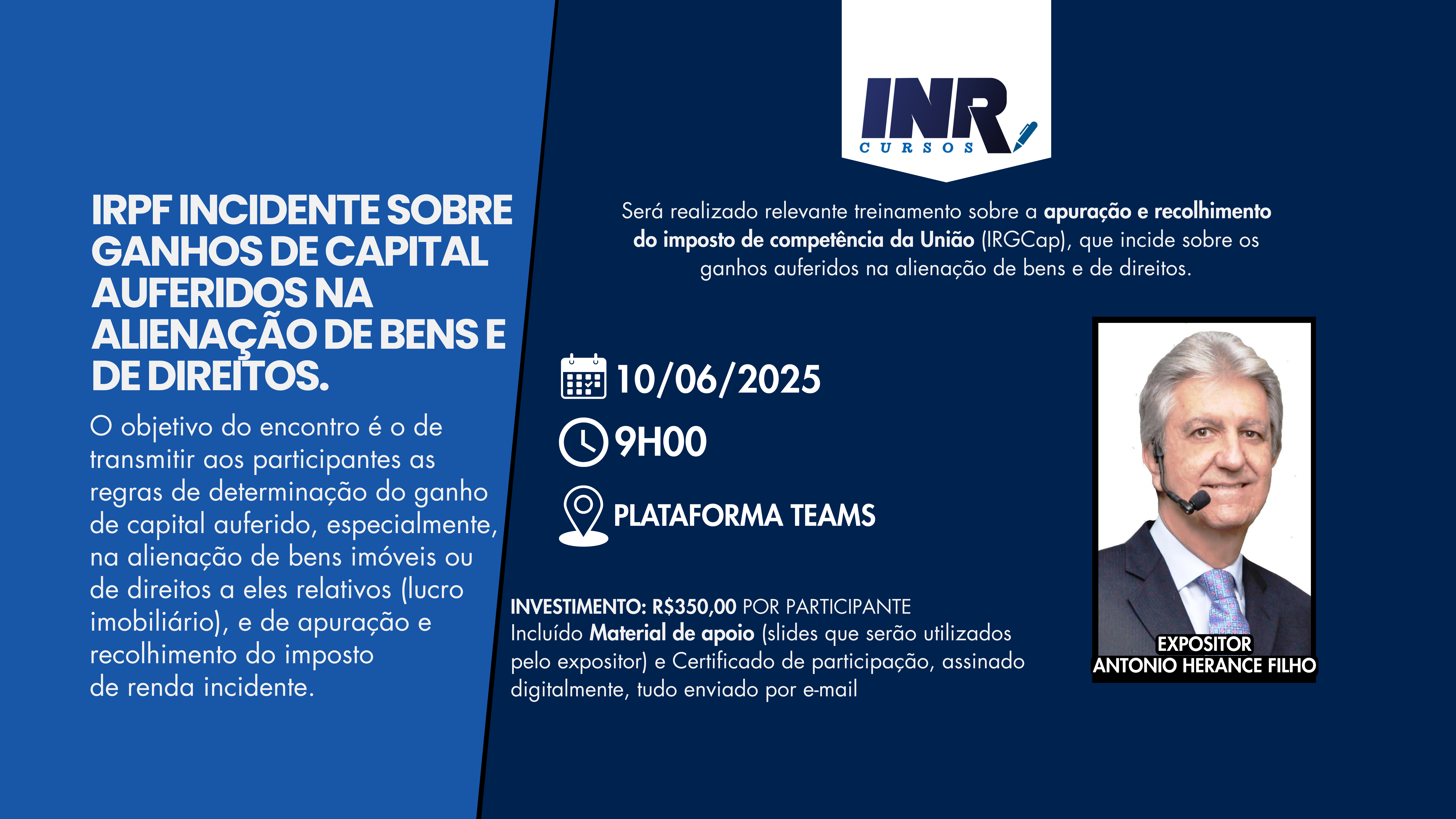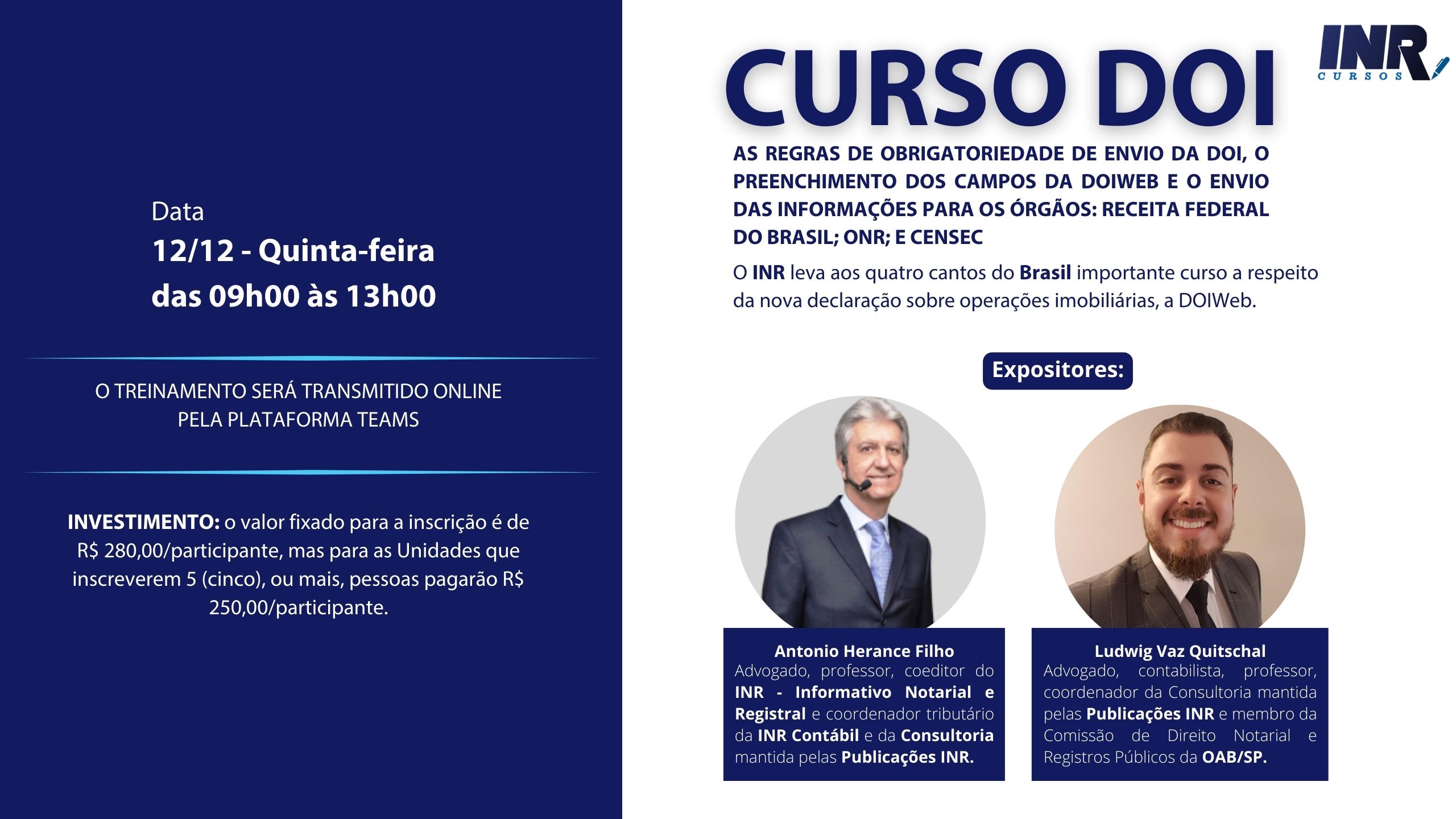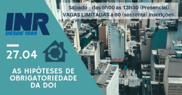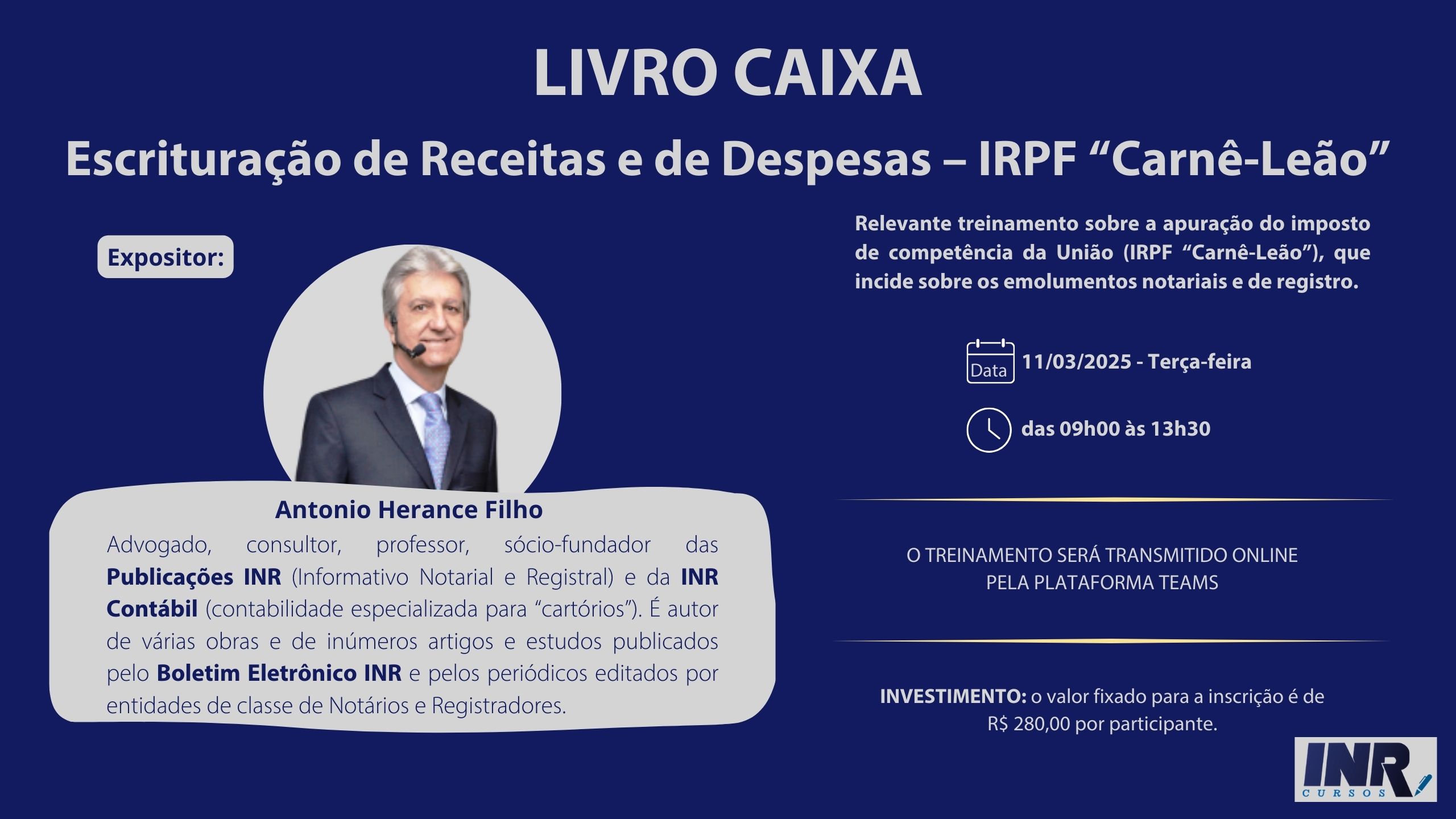 Com frequência são organizados cursos sobre temas de relevância ao exercício das funções notarial e registral. Os principais temas têm sido: IRPF - Livro Caixa; IRPF - Ganhos de Capital; DOI - Declaração Sobre Operações Imobiliárias; ITBI - Imposto Sobre Transmissão de Bens Imóveis e Direitos a ele relativos; e ITCD - Imposto Sobre a Transmissão "Causa Mortis" e Doação. Mais abaixo você confere os cursos que estão com inscrições abertas.